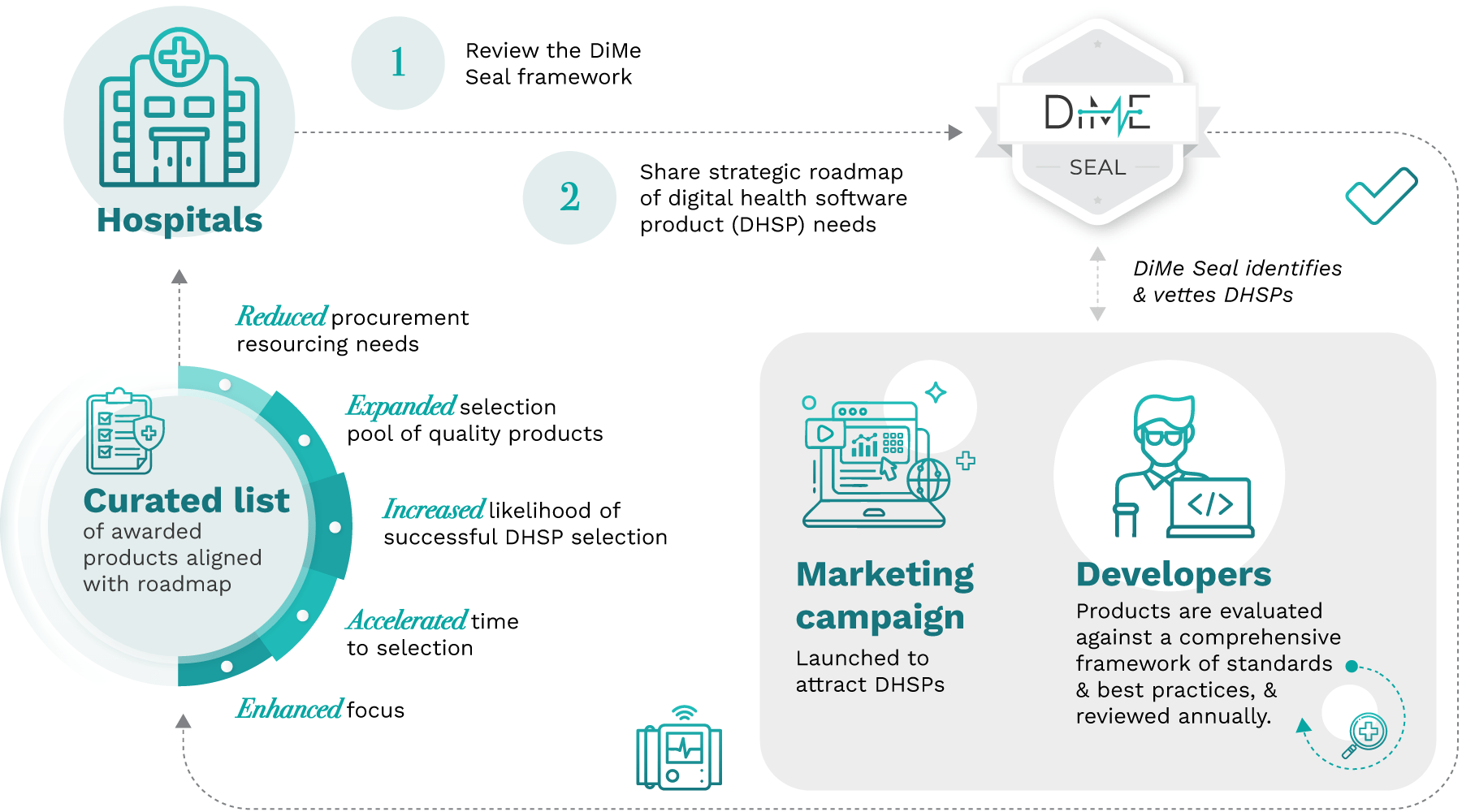 At DiMe, we invite health systems to join us in advancing the highest standards of digital health. By prioritizing evaluation frameworks like the DiMe Seal, we can work together to ensure digital health software meets the trustworthiness and quality patients and providers deserve. Be part of the movement driving meaningful change in digital health—your support makes a difference.